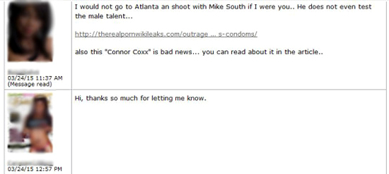 The model that forwarded me the following conversation was aware of the dangers of dealing with amateur producer Mike South and was warning the other gal about shooting with him. Apparently the young performer was unaware of the South disease factory’s (non-)testing practices, so she sent her a link to TRPWL‘s 2014 exposé: