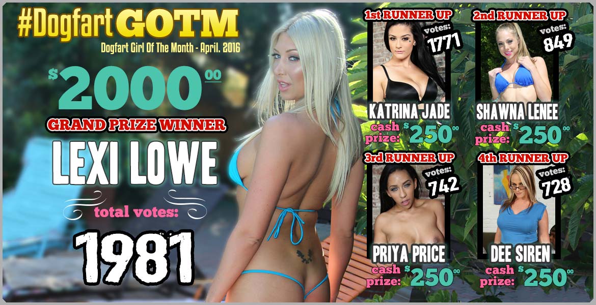CyberSpace- After finishing a close second in March, Lexi Lowe pulled out the big twitter guns to take home first place in April’s Dogfart Girl of the Month contest!