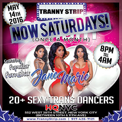 NYC’s premier trans nightlife company, TGirl Events, has expanded their popular “Tranny Strip” event to include a monthly Saturday party at HQNYC Club starting May 14, 2016 with special guest host TS star Jane Marie.