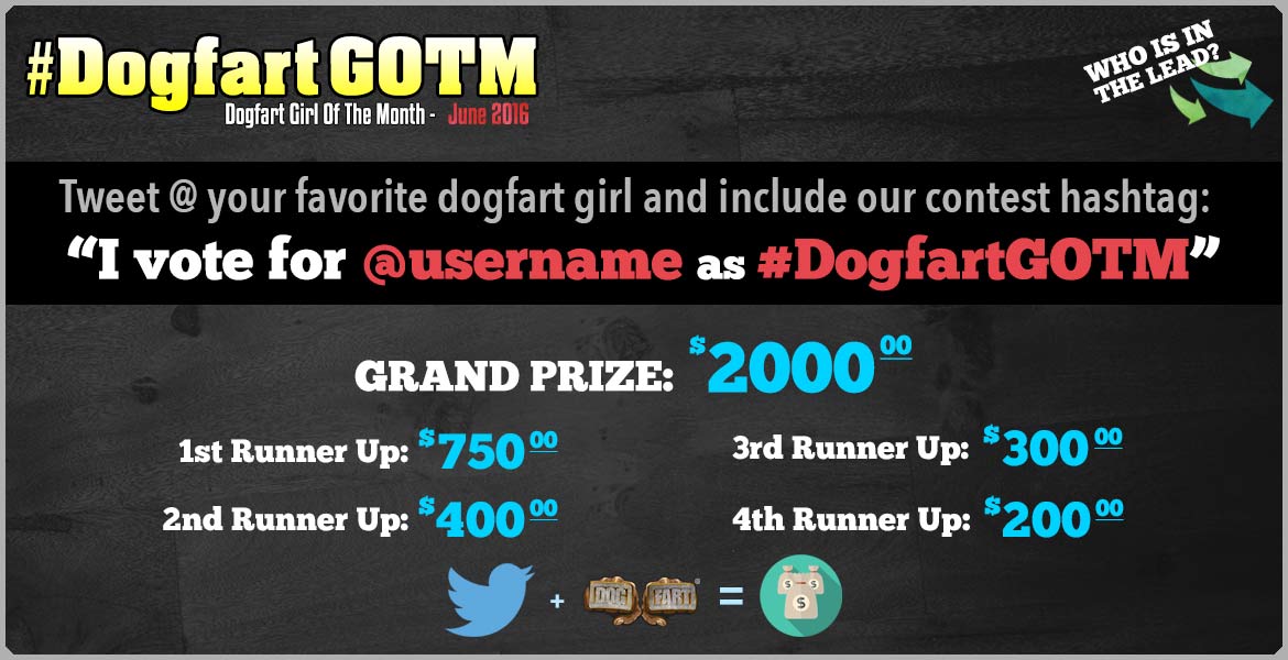 “It was tough watching a girl get 2000 re-tweets, come in second, and get the same prize money as the 5th place finisher,” said a Dogfart rep. “It just made sense to have different amounts for the 2nd ($750), 3rd ($400), 4th ($300), and 5th ($200) places, while the 1st place winner will still get $2000. We want our winner (and their fans) to know their votes are truly worth the effort.”