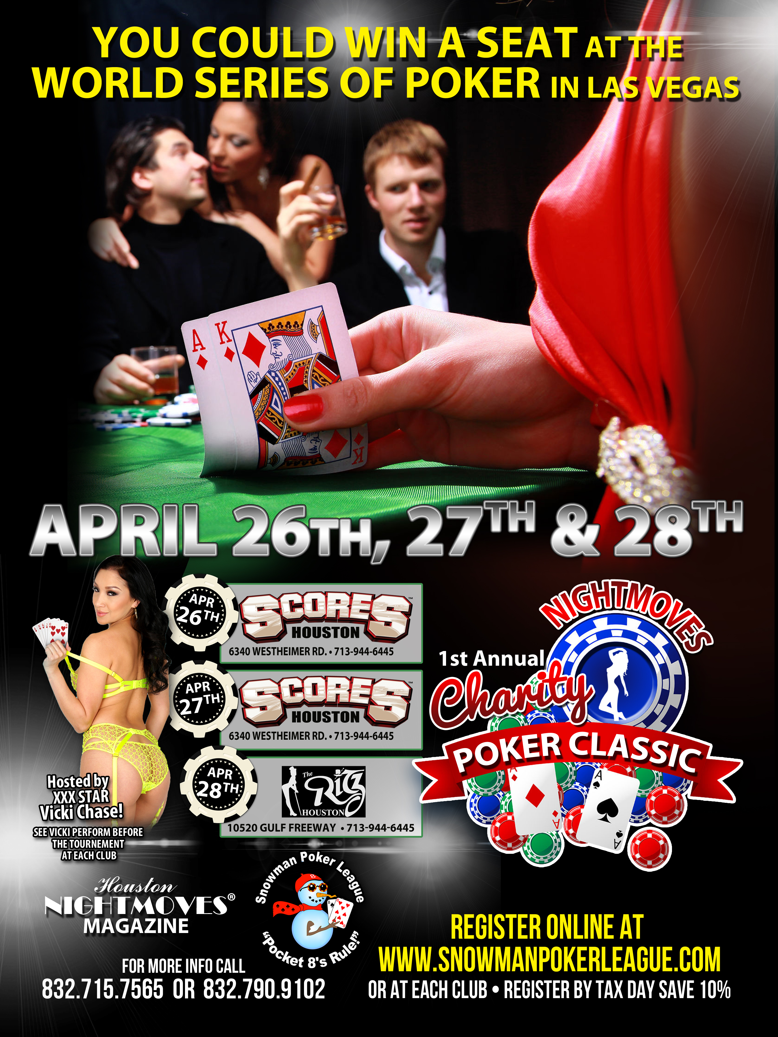 Gorgeous and exotic Vicki Chase will be hosting and performing at Houston NightMoves Magazine’s First Annual Charity Poker Classic at Scores Houston on Wednesday, April 26 and Thursday, April 27 and at The Ritz on Friday, April 28.