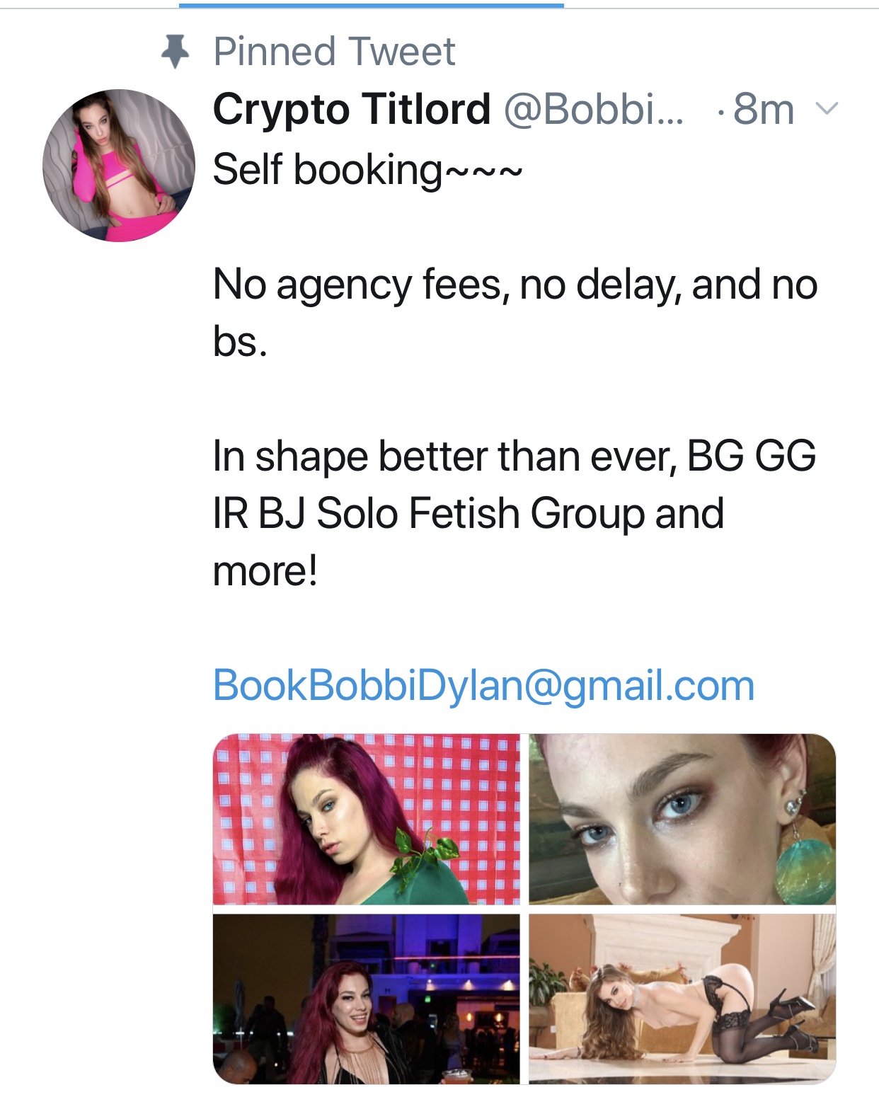 Self booking? Last Friday she was with ATMLA. One can only speculate as to why ATMLA dumped her. If I was a betting man, I’d say it was connected to her constant cracked out of her mind tweets.
